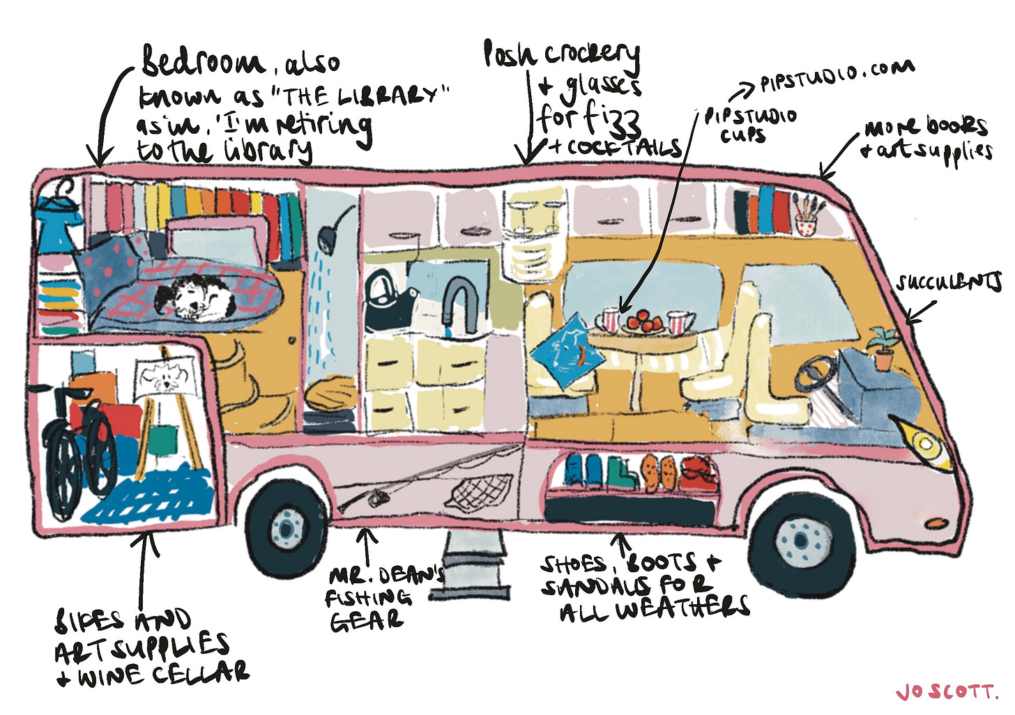 I’m a sucker for those cutaway house illustrations so here’s one of our van which includes all our ‘homey’ touches and like the illustration at the top of this post is heavily influenced by the colour palette of the book cover.